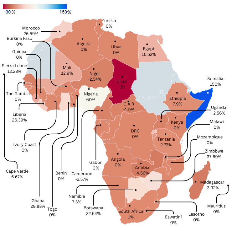 Fig 1: Percentage change in petrol price across Africa, February 23rd, 2026 – March 31st, 2026
