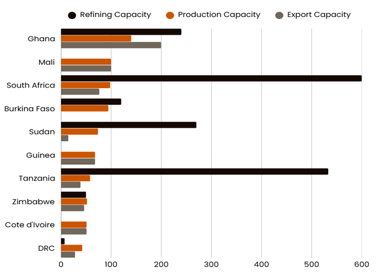 A recurring theme across Africa’s extractive industries is the export of raw materials without fully benefiting from the value chain. The DRC aims to reverse this trend by developing refining capacity in its gold industry. Although the refinery’s capacity only covers about 15.5% of its production, most of which is artisanal, its ability to now produce some quantity of refined gold (up to 99.9% purity) increases the value of its export by 40.6% without an increase in production volume.